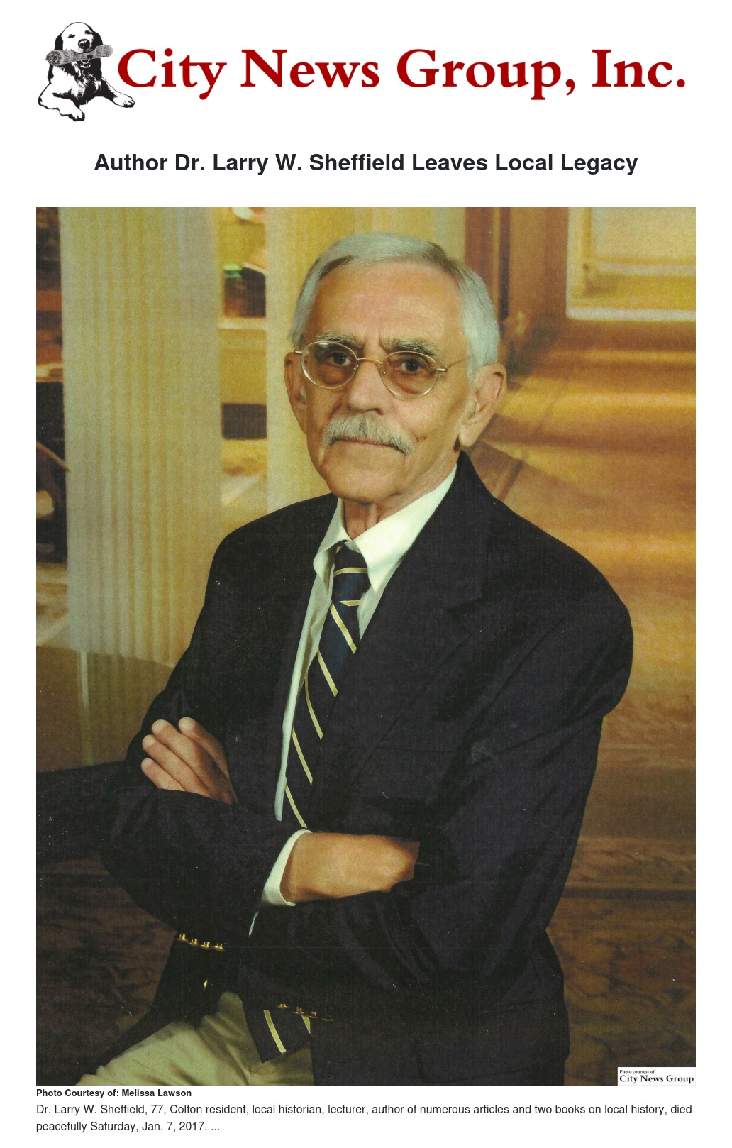 COLTON>> Dr. Larry W. Sheffield, 77, Colton resident, local historian, lecturer, author of numerous articles and two books on local history, titled "Images of America: Colton," and "David Colton: Namesake of Colton, California," died peacefully Saturday, Jan. 7, 2017 with family by his side near Sacramento.