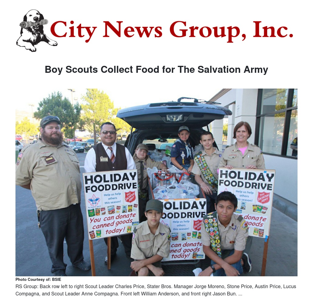 Boy Scouts from San Bernardino, Rialto, Colton, Highland, Grand Terrace, Fontana and Bloomington collected food for the Salvation Army. They were participating in a nationwide event the Boy Scouts of America calls “Scouting for Food.”