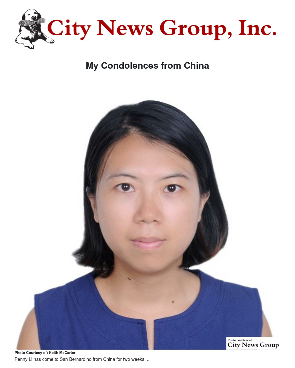 My condolences to the victims' families of the Dec. 2 horrific incident. I am from China and I have come to San Bernardino to request that the City of San Bernardino to re-instate the Sister City program for China. This trip was planned much before the horrific incident.