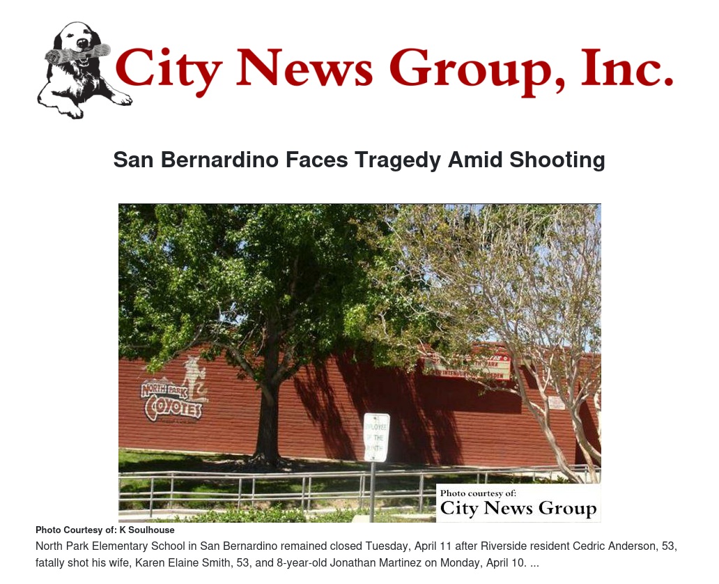 SAN BERNARDINO>> North Park Elementary School remained closed Tuesday, April 11 after Riverside resident Cedric Anderson, 53, fatally shot his wife, Karen Elaine Smith, 53, in her classroom and killed an 8-year-old boy named Jonathan Martinez on Monday, April 10.