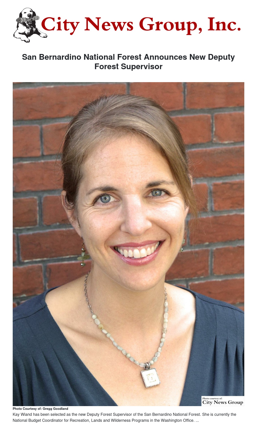 SAN BERNARDINO>> Kay Wiand has been selected as the new Deputy Forest Supervisor of the San Bernardino National Forest. She is currently the National Budget Coordinator for Recreation, Lands and Wilderness Programs in the Washington Office.