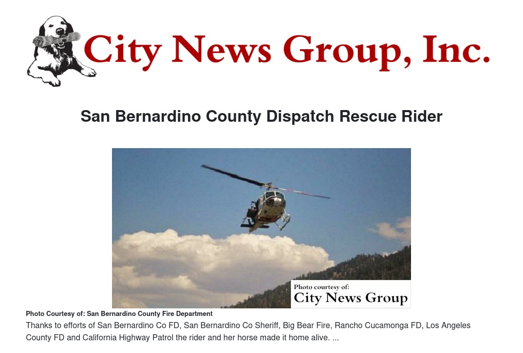 SAN BERNARDINO>> On May 11, 2017 the San Bernardino County dispatch center was notified that a female rider and her horse had fallen approximately 300 feet from the Santa Ana River Trail in Angelus Oaks.