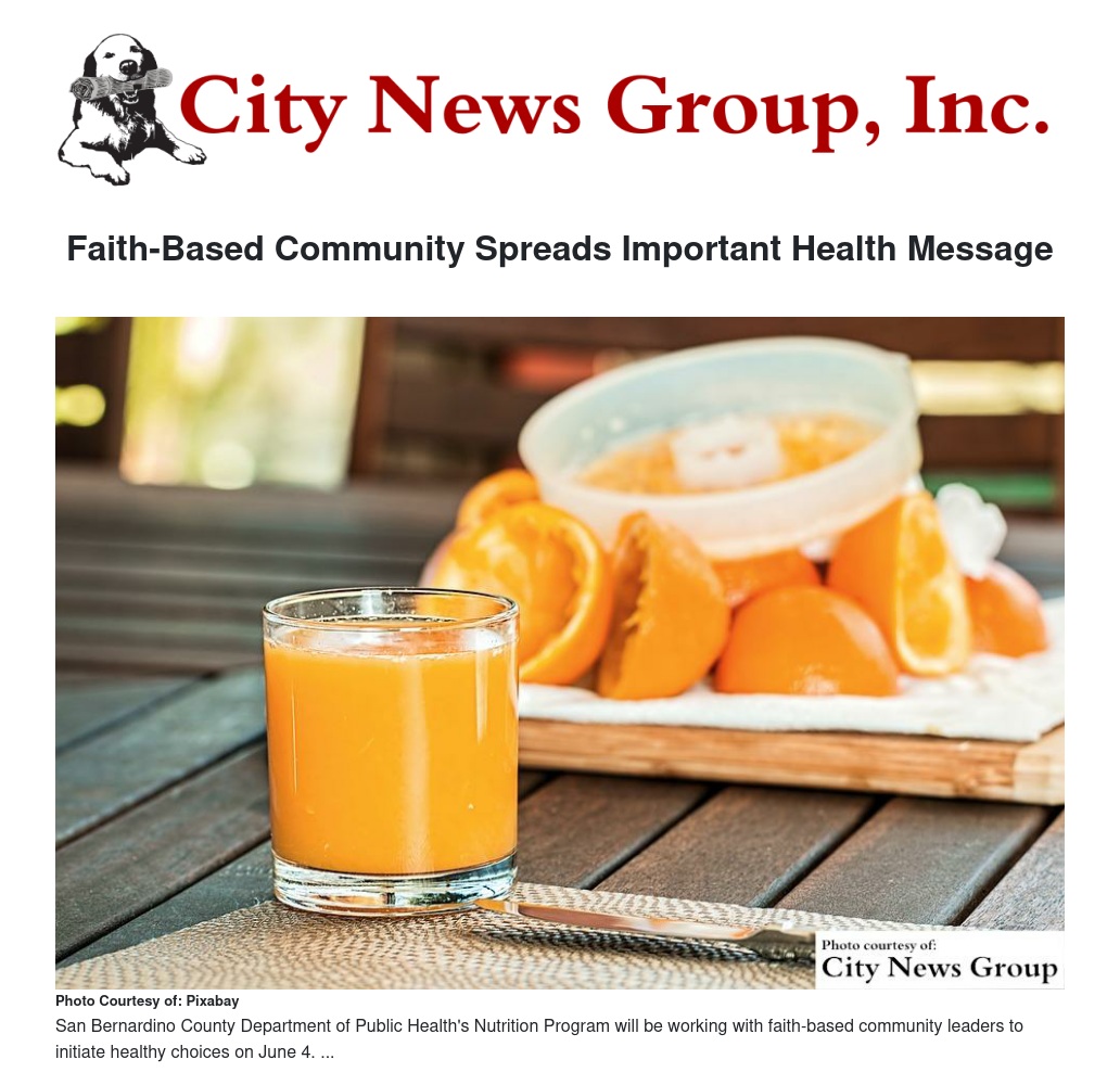 "We want faith-based leaders regardless of their religion or denomination to partner with us and our Perfecting the Temple Sunday by delivering important messages that will help people throughout San Bernardino County live healthier lives," said Bronica Martindale-Taylor, Health Education Assistant for the county's Nutrition Program. "Because so many families are touched by faith-based organizations, we see them as very important partners in our fight against chronic diseases in the county."