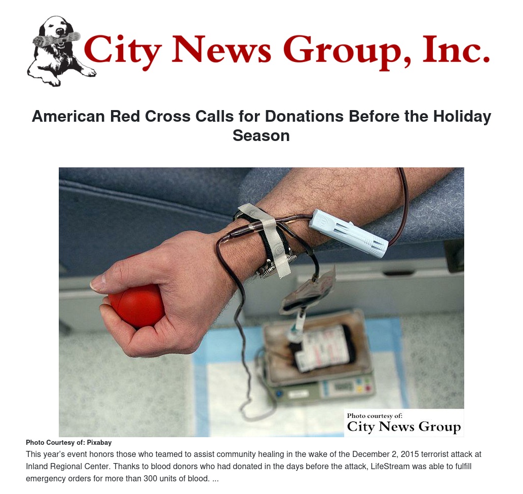 SAN BERNARDINO>> The American Red Cross encourages eligible donors to give blood to help stock the shelves before the busy holiday season.