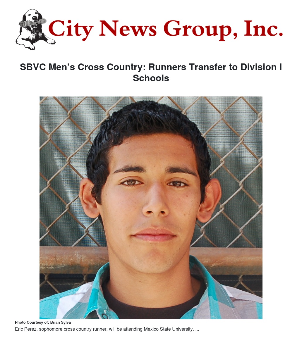 Perez collected a State Championship in 2010, and was the top finisher in 2011 (9th place), wrapping up with a time of 20:25. The 2011 team finished second at the State Finals, 42 points behind American River College at the state meet in Fresno, thus ending SBVC’s 5-year string of dominance in Men’s Cross Country. Perez did not compete in 2012.