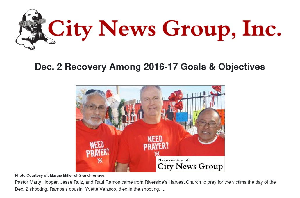 Continuing to support county employees affected by the Dec. 2 terrorist attack and assisting in the overall recovery of the community were among the goals and objectives for the coming year unanimously adopted Tuesday (March 1) by the Board of Supervisors.