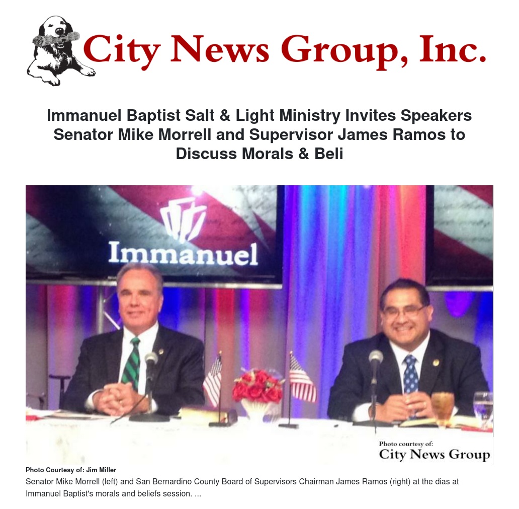 Immanuel Baptist Salt & Light Ministry Invites Speakers Senator Mike Morrell and Supervisor James Ramos to Discuss Morals & Beli