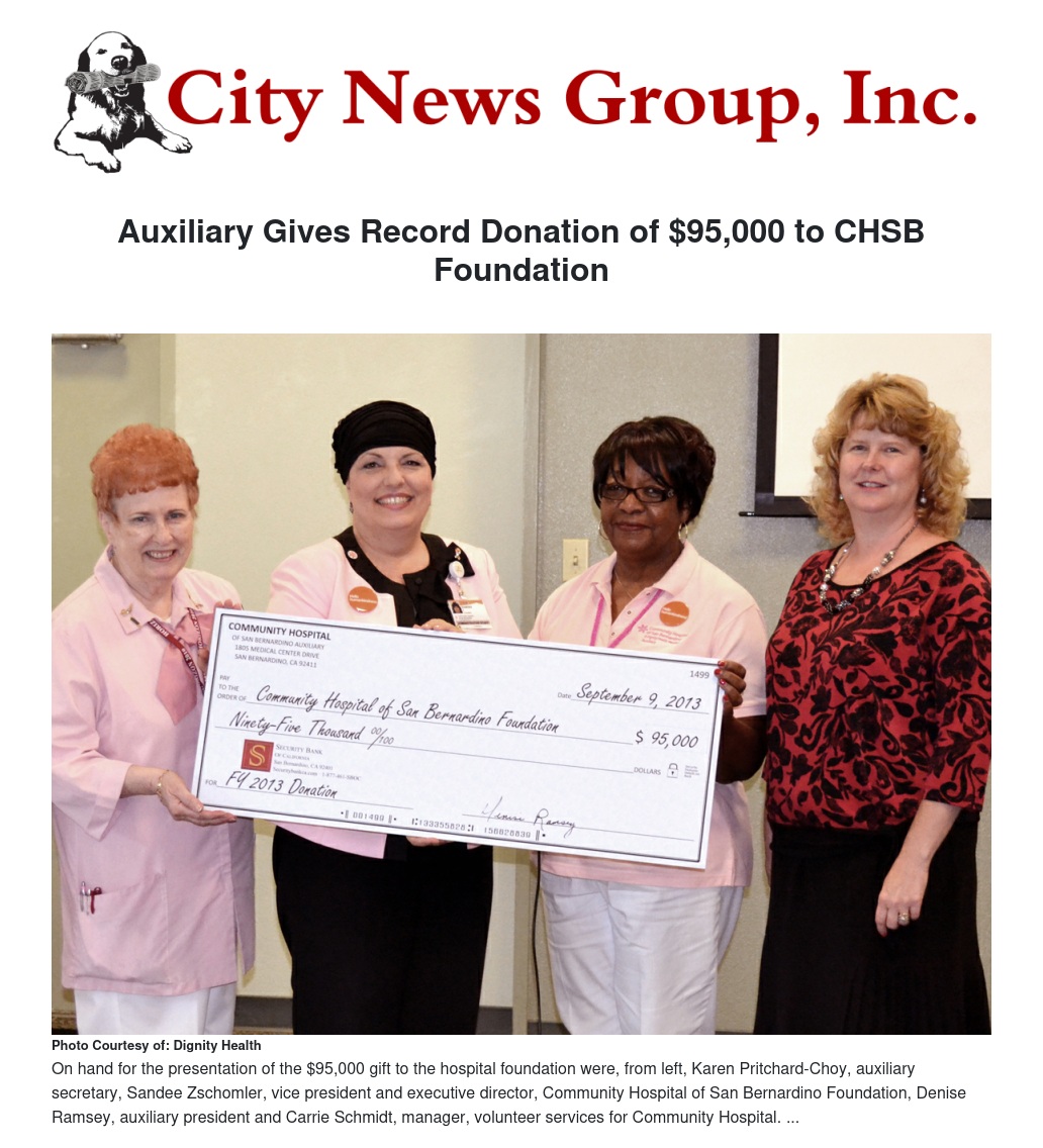 The Auxiliary of Community Hospital of San Bernardino (CHSB) recently presented a check for a record-breaking $95,000 to the hospital Foundation. The funds were raised through numerous activities conducted during the past year and will be used by the hospital to benefit health related services for enhanced patient care.