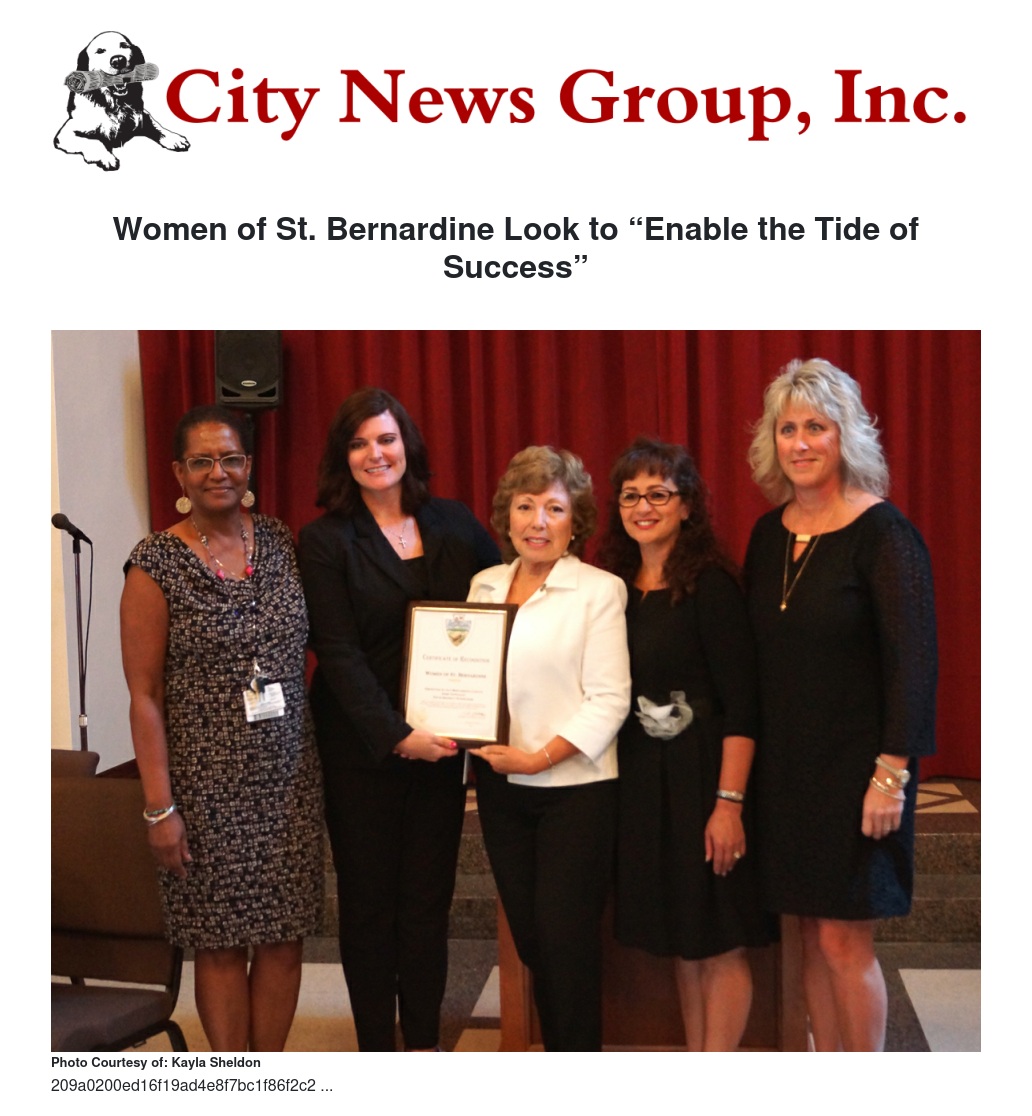 As her comments came to an ending point, Gonzales presented a certificate of recognition accepted by Sara Hector of the Visiting Angels on behalf of the founding members, who include community advocates, leaders and businesswomen such as Regina Webster of the St. Bernardine Medical Center Foundation, Margie Miller of the City News Group, Maribel Brown of Minuteman Press, and Kimberly Foglio-Walden of Budget Transmissions II and a longtime St. Bernardine Medical Center volunteer, who all work to better their communities through organizations such as this.