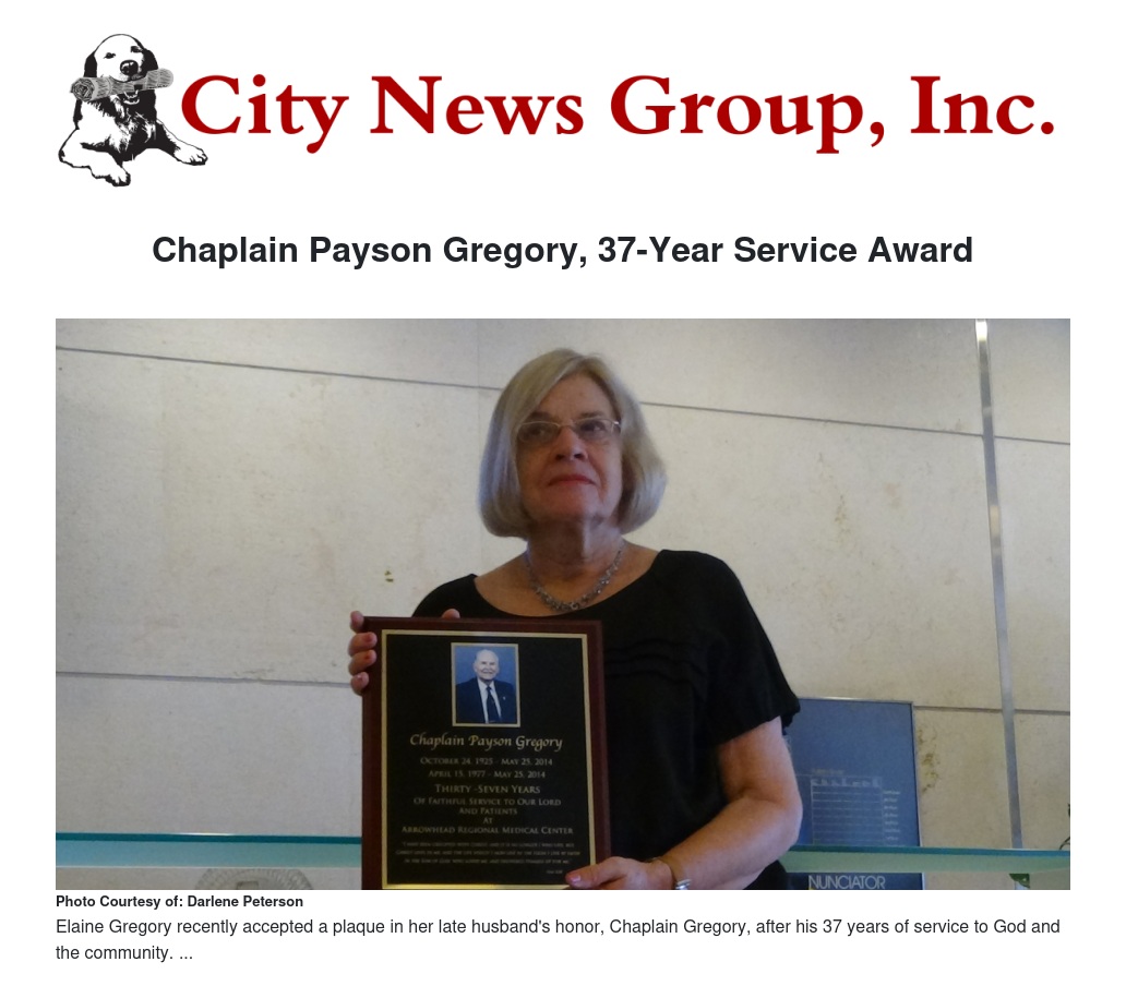 On May 25 of this year Chaplain Gregory passed away in one of the beds at Arrowhead Regional Hospital where he had served faithful as their Chaplain 24/7 sharing God’s love and forgiveness, a real asset in the healing process. He was recently honored with a plaque at the Arrowhead Regional Hospital for his 37 years of service.