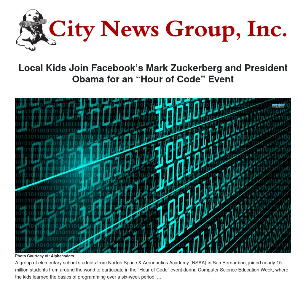 A group of elementary school students from Norton Space & Aeronautics Academy (NSAA) in San Bernardino, joined nearly 15 million students from around the world to participate in the “Hour of Code” event during Computer Science Education Week (Dec. 9-15).
