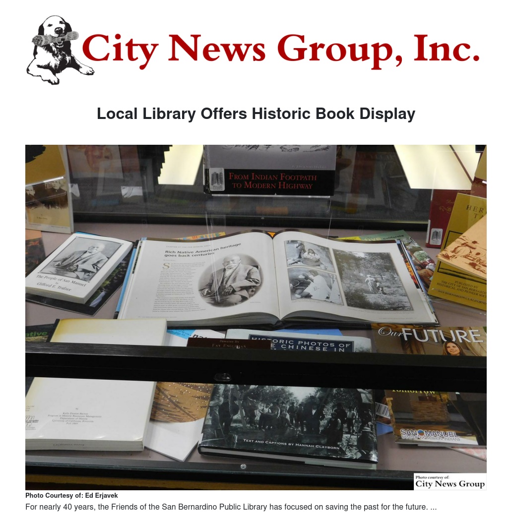 “We are pleased to have this display of local history resources to demonstrate the wider heritage of communities that make up this valley,” said Ed Erjavek, the library director of the San Bernardino Public Library. “The Friends of the San Bernardino Public Library recently received $40,000 from the San Manuel Band of Mission Indians for library books for the benefit of the patrons served by our library system. We’re pleased to collaborate with the San Manuel Band of Mission Indians to emphasize our library as an important source for accessing local heritage.”