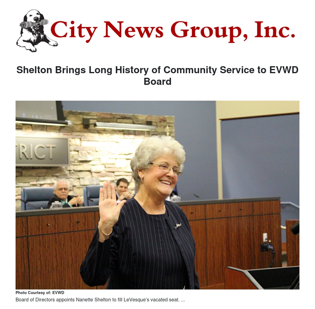 A resident of San Bernardino since 1965, Shelton has made her home in the EVWD service area for nearly 50 years. Her deep ties to the community, devotion to service and experience in customer care distinguished her from the more than a dozen community members who applied for the District’s recent board member vacancies, according to District representatives, with her appointment sparing ratepayers the expense of an additional election.