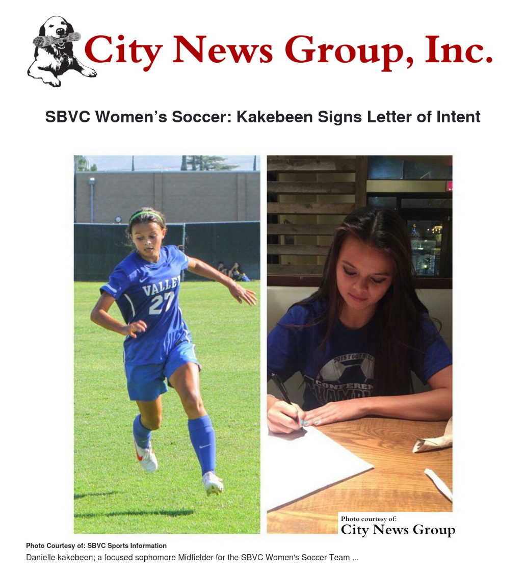San Bernardino >> SBVC Women's Soccer sophomore midfielder Danielle Kakebeen (Rancho Cucamonga H.S.) has signed a letter of intent with McPherson College.