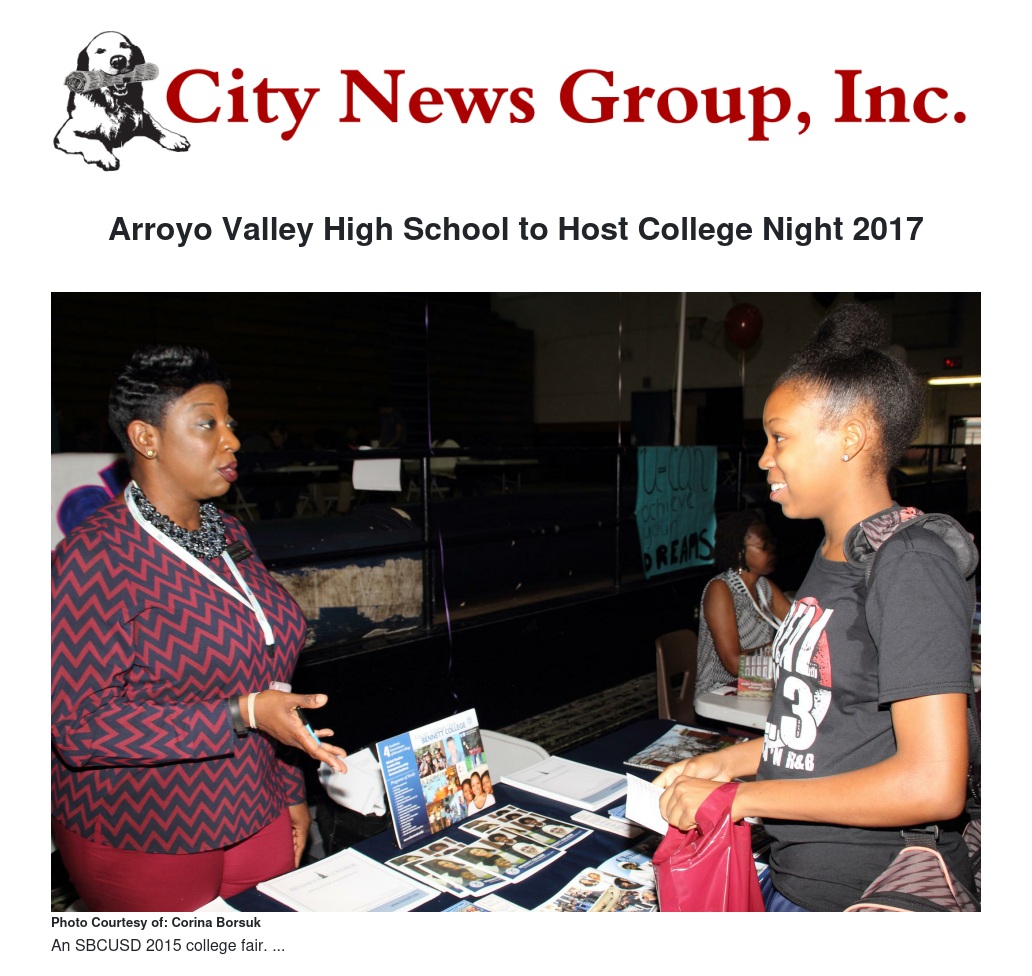 Arroyo Valley High School is hosting the San Bernardino City Unified School District’s 27th Annual College Night on Thursday, September 28 from 6 to 8 p.m.