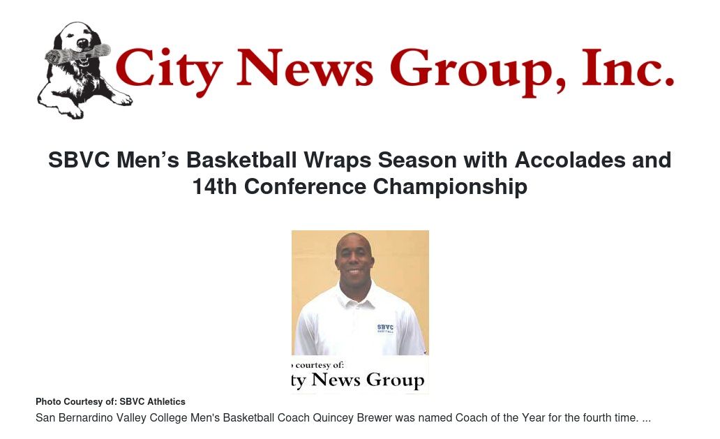 Under the tutelage of seventh-year coach Quincy Brewer, San Bernardino Valley College Men's Basketball ended the 2014-2015 season claiming their 14th Conference championship, the Foothill Conference Coach of the Year award and the MVP award was handed to sophomore guard Charles Callison.