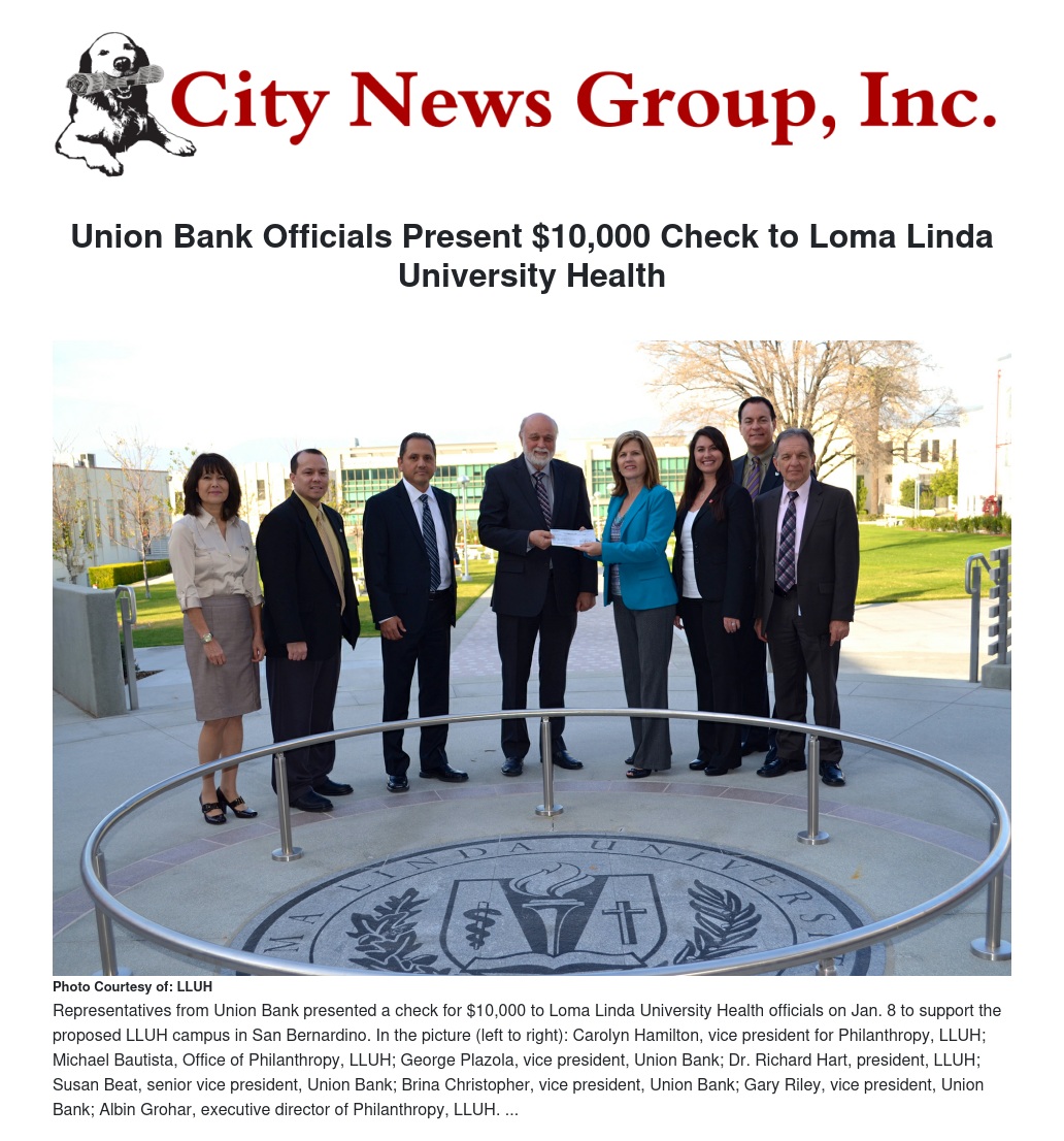 Last year, Union Bank representatives donated $25,000 to LLUH to help pay for the planning phase of the San Bernardino campus. The latest donation, including an additional $5,000 expected shortly, puts the bank’s total donation at $40,000 to help pay for planning for the San Bernardino campus.