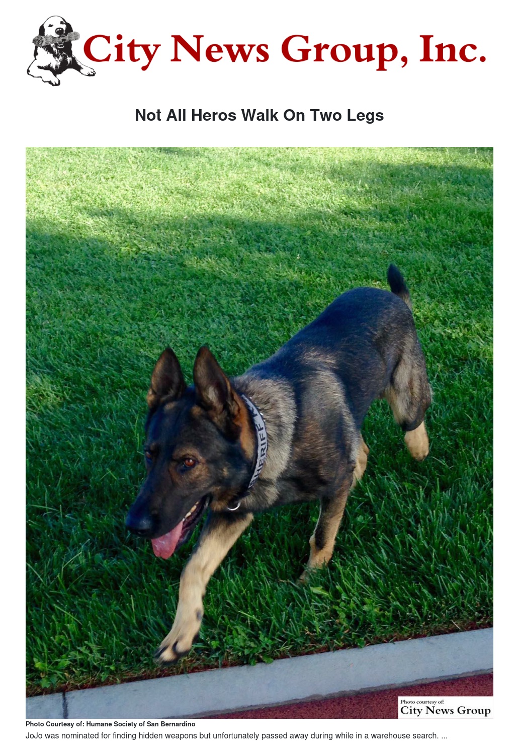 SAN BERNARDINO >> The Humane Society of San Bernardino Valley is proud to announce their 2016 Pet Hero Award recipients: Chandler, a terrier mix from Redlands; Chet, a pit bull from Devore; and Jojo, a German Shepherd San Bernardino County Sheriff’s Department K-9. All three pets will be honored during the Humane Society of San Bernardino Valley’s Walk for the Animals, on Saturday, May 21st at San Manuel Stadium (280 South E Street, San Bernardino).