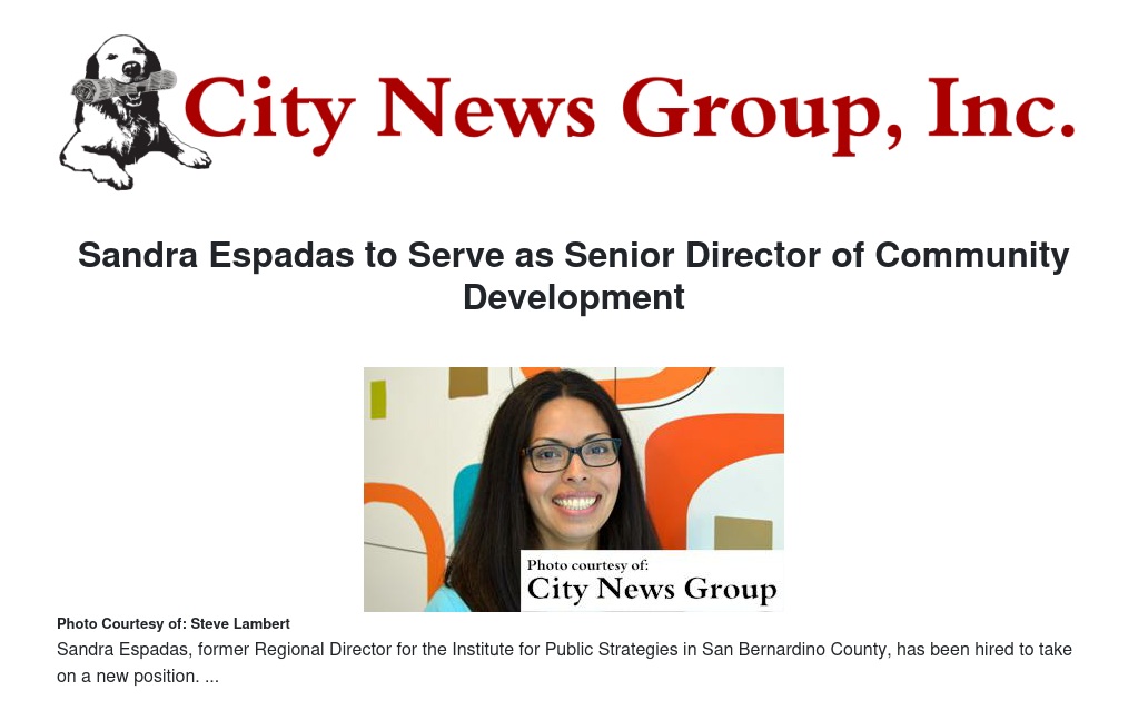 SAN BERNARDINO >> Sandra Espadas, former Regional Director for the Institute for Public Strategies in San Bernardino County, has been hired as Senior Director of Community Development for the Hope through Housing Foundation, focusing primarily on the Arrowhead Grove Neighborhood Revitalization project.