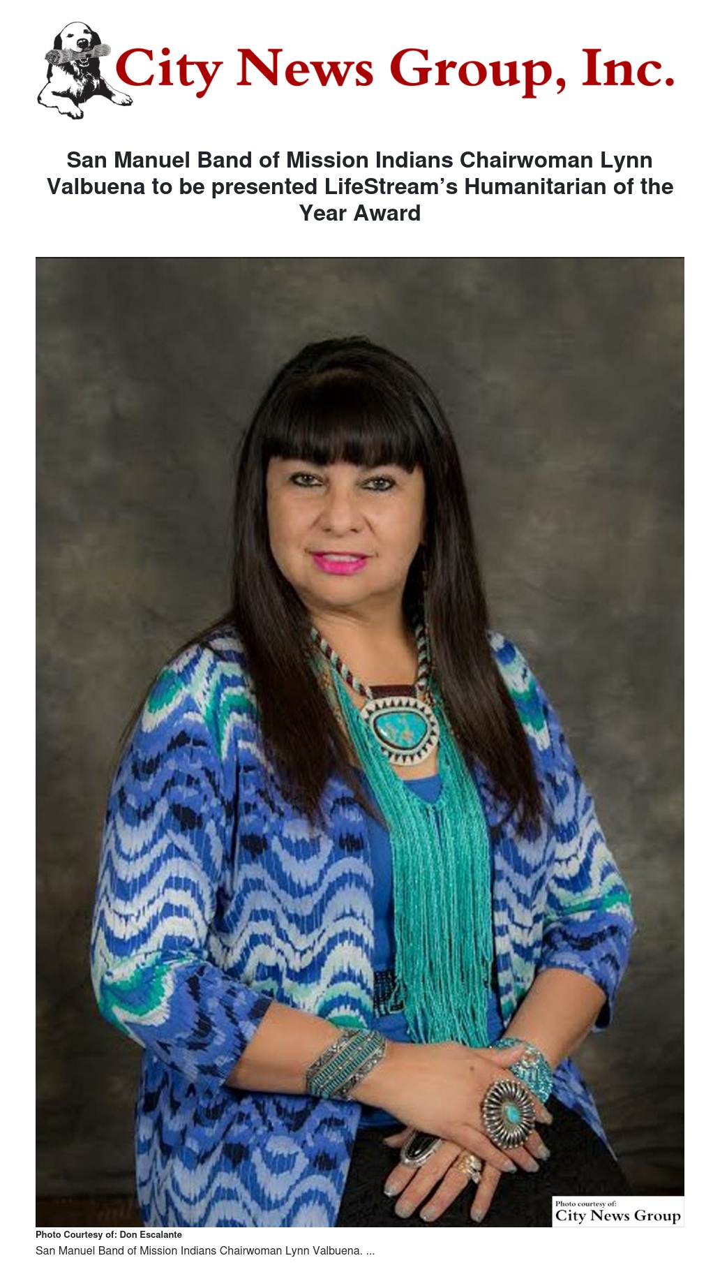 San Manuel Band of Mission Indians Chairwoman Lynn Valbuena has been named LifeStream blood bank’s Inland Empire Humanitarian of the Year for 2016.