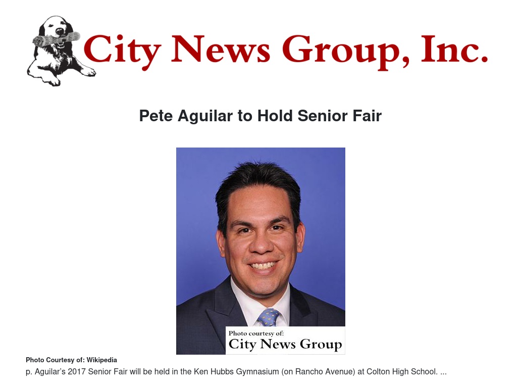 San Bernardino>> Rep. Pete Aguilar (D-San Bernardino) will hold his 2017 Senior Fair on Friday, July 7th at the Ken Hubbs Gymnasium at Colton High School. This will be the third senior fair Rep. Aguilar has held since 2015, continuing a series that offers Inland Empire seniors access to free health screenings and food programs, and assistance with Social Security, Medicare and veterans benefits.