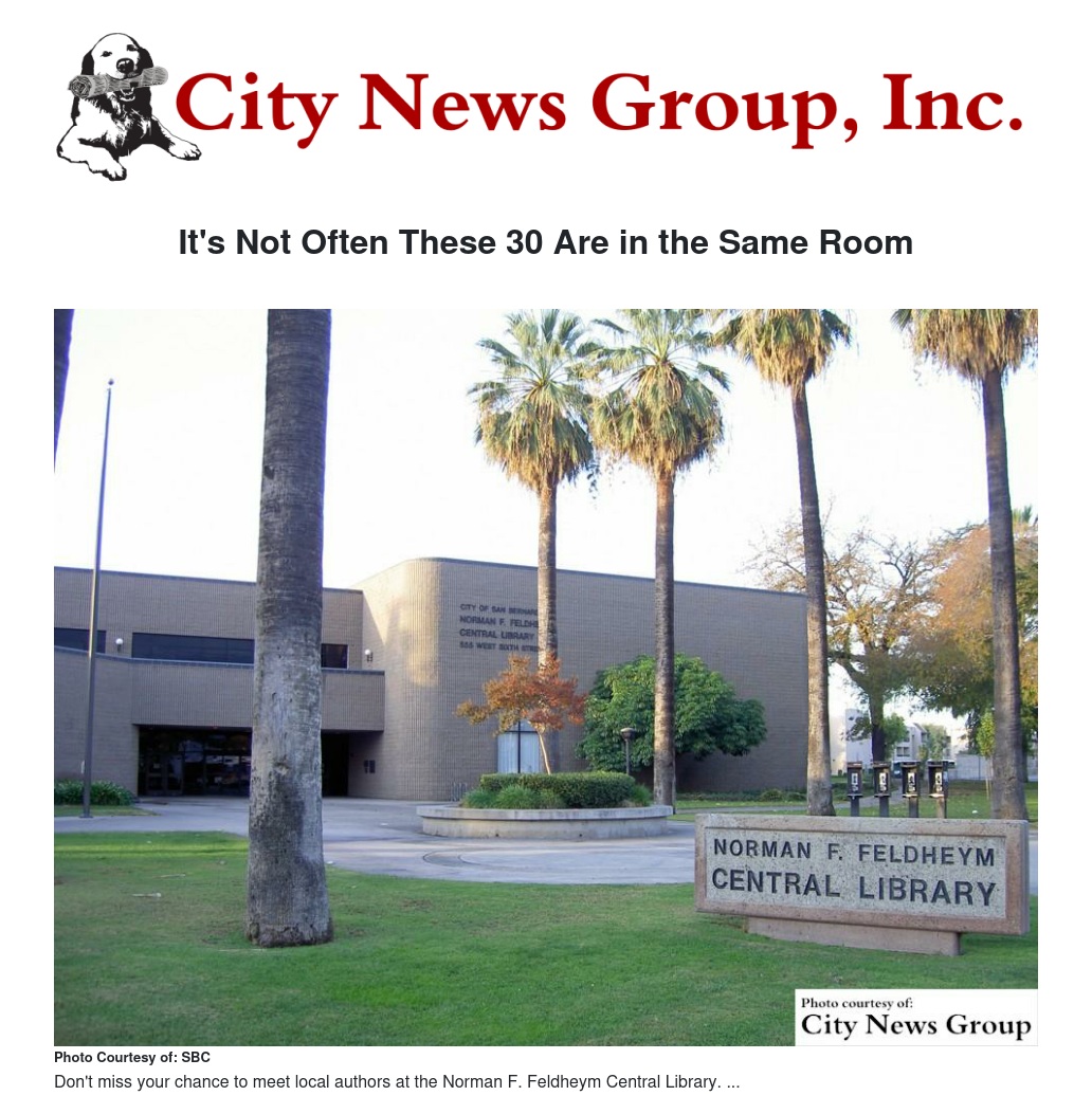 SAN BERNARDINO >> Authors from throughout Southern California have been invited to discuss their works and sell and sign books at the Norman F. Feldheym Central Library, Saturday, April 23, 2016 from 1 to 5 p.m.