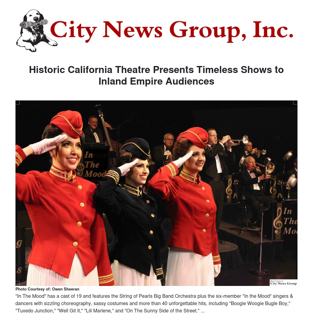 Some orchestral productions that have been featured at the California Theatre include the San Bernardino Symphony and the String of Pearls Big Band Orchestra.