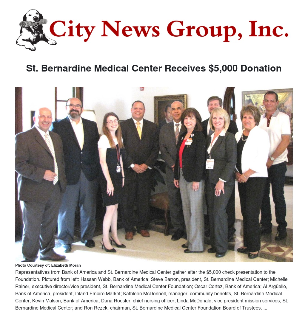 St. Bernardine Medical Center Foundation received a $5,000 donation from Bank of America to support the hospital’s Stepping Stones program, a teen and young adult volunteer and career development program. Bank of America presented the check to the Foundation early this month.