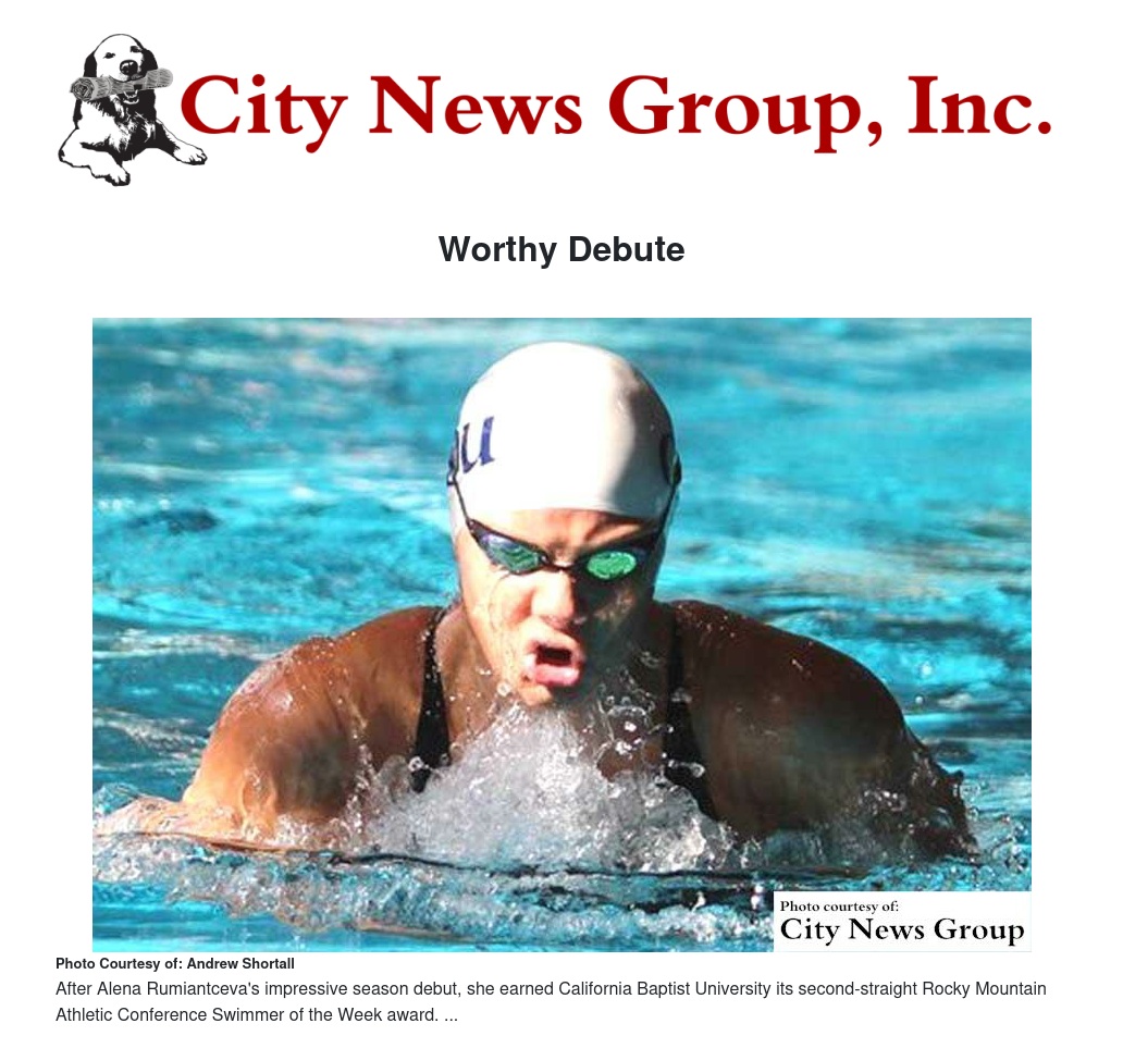 After Alena Rumiantceva's impressive season debut, she earned California Baptist University its second-straight Rocky Mountain Athletic Conference Swimmer of the Week award, as announced Wednesday, Oct. 28.