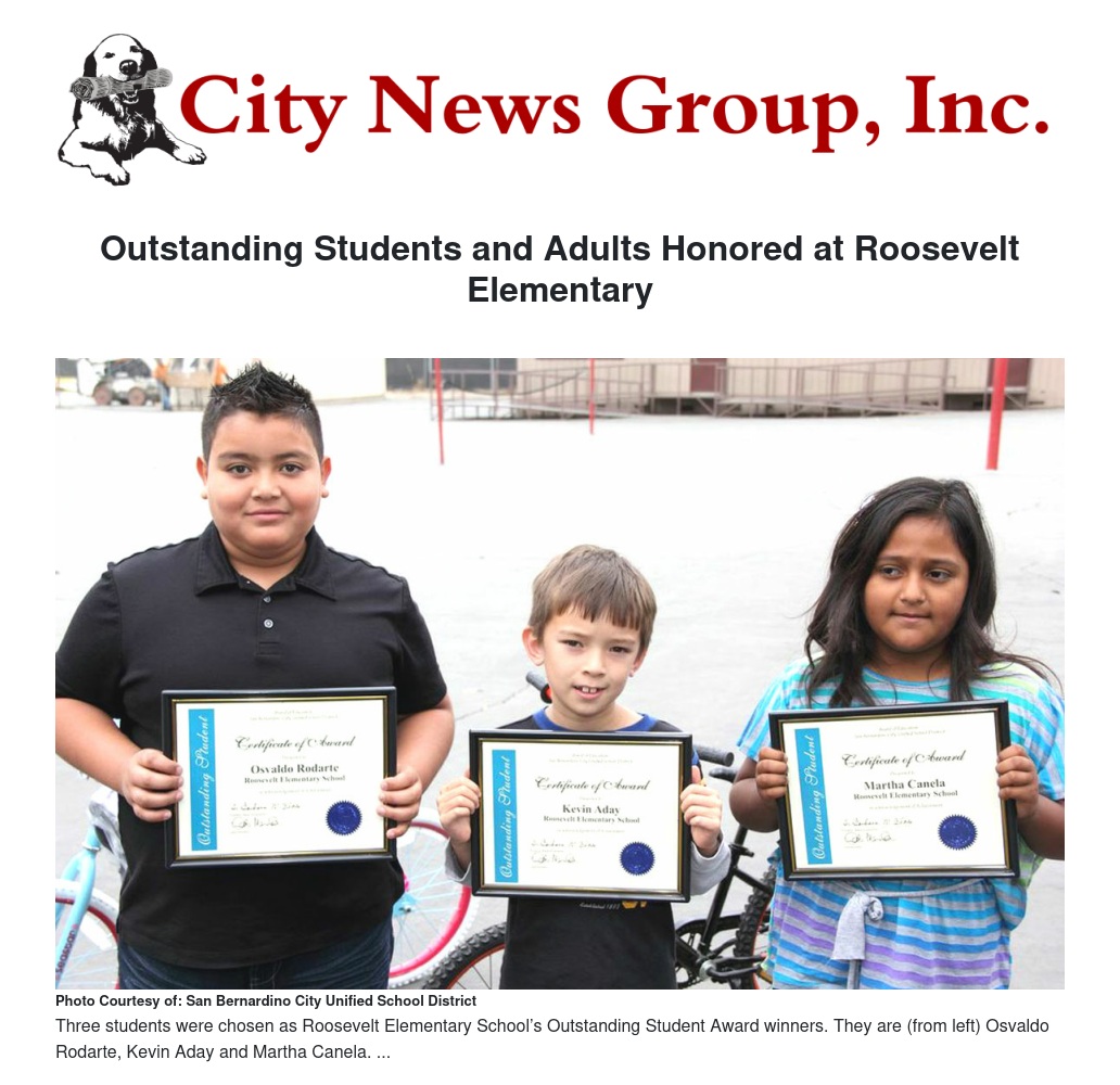 Roosevelt Elementary School was one of three San Bernardino elementary schools to have these awards bestowed upon it. In the July 25 edition of the San Bernardino City News, the awardees from Riley Elementary School were announced. (Call The City News at 909-370-1200 to find out how you can view this article or obtain an e-edition of this newspaper.)