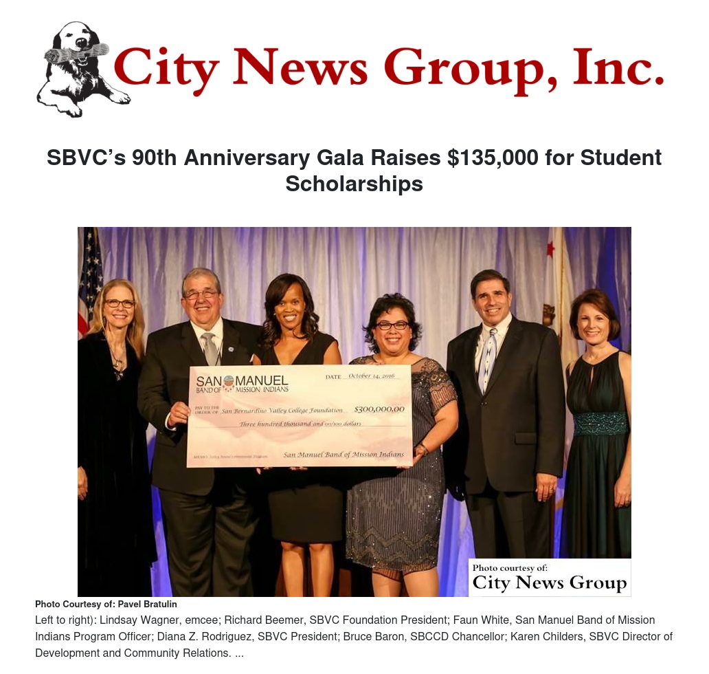 SAN BERNARDINO>> On Friday, Oct. 14, the San Bernardino Valley College Foundation’s 90th Anniversary Gala brought hundreds of alumni, dignitaries and philanthropists to campus to celebrate SBVC’s 90th anniversary and to raise funds for student scholarships.