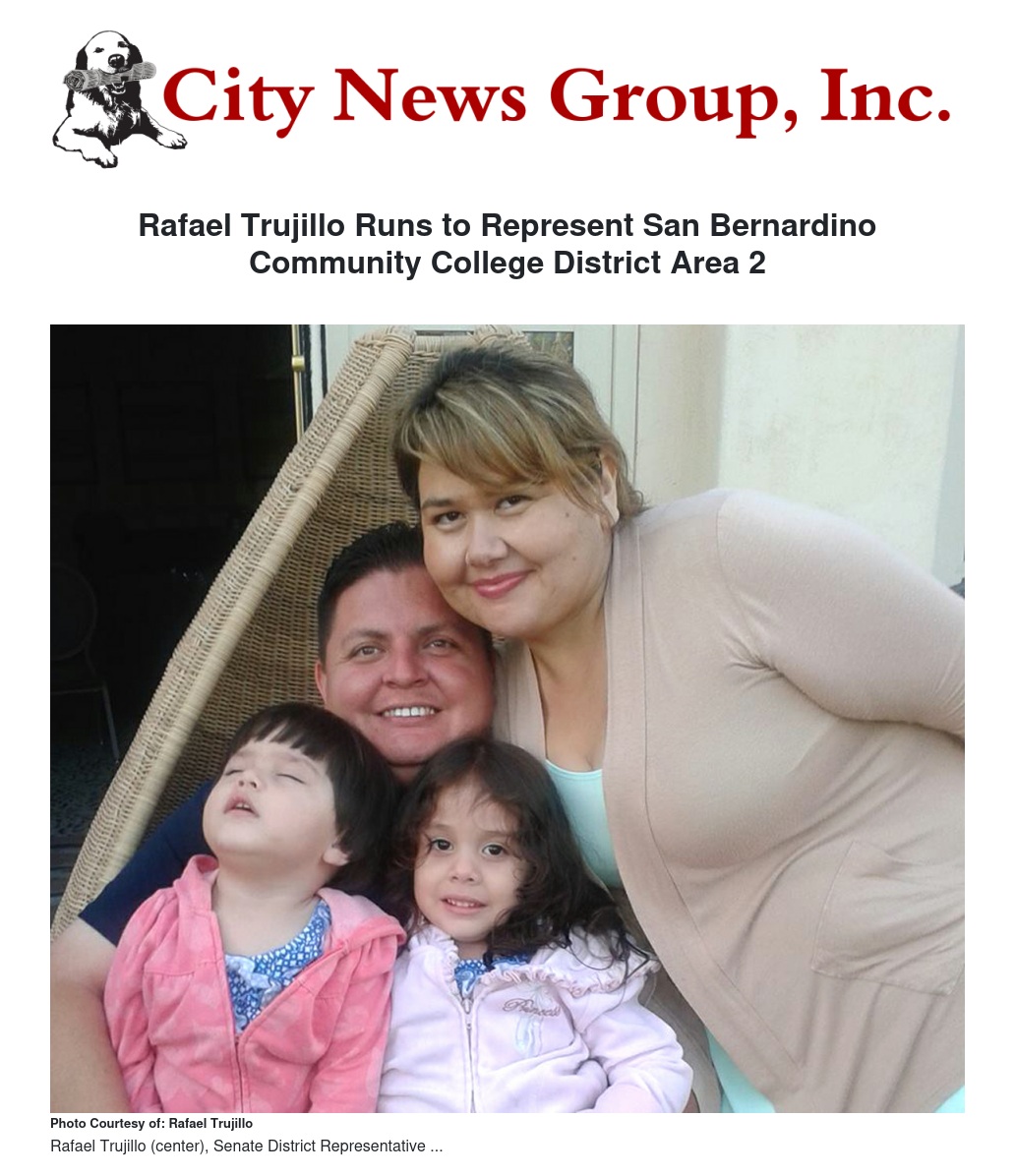 Rialto resident Rafael Trujillo, a legislative aide to California State Senator Norma Torres, will run this November to represent the San Bernardino Community College District’s Area 2, which comprises the areas of Rialto, Muscoy and Fontana.