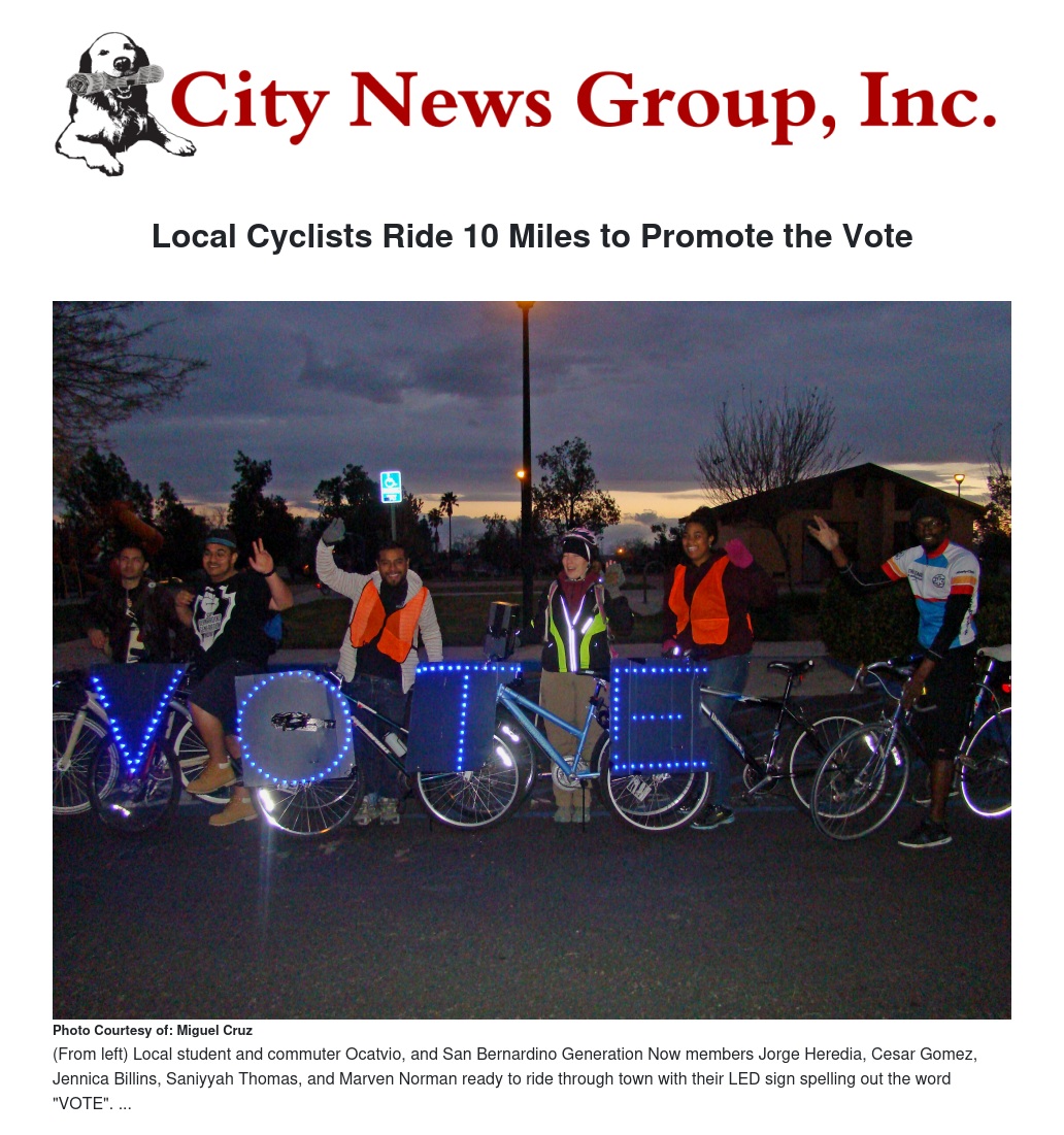 San Bernardino Generation Now (SBGN) and supporters gathered at Littlefield/Shultis Memorial Park last Sunday evening for a bicycle ride through the city. The 10-mile ride organized by Jorge Heredia, member of San Bernardino Generation Now, was part of an ongoing campaign which included two earlier bike rides the week prior, with the goal of raising local awareness on the importance of voter participation and increasing voter turnout in this week's City elections.