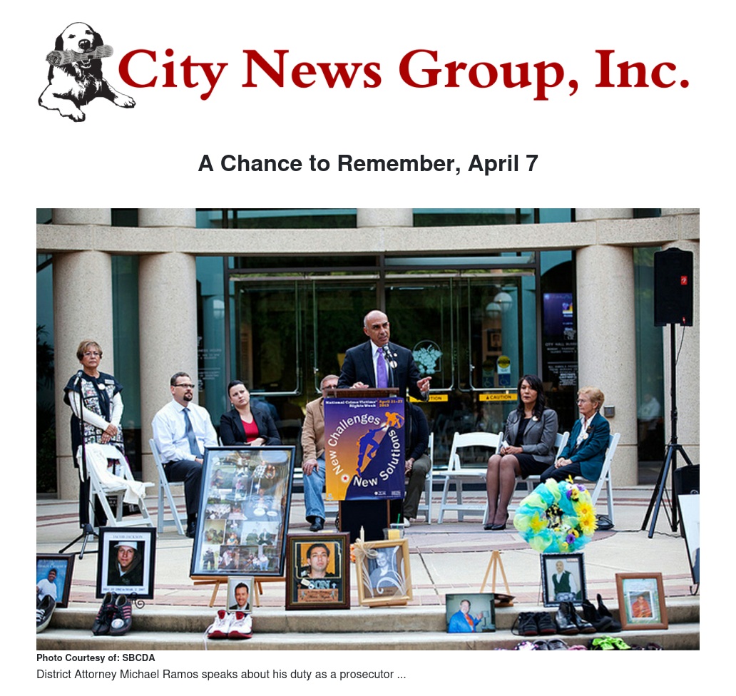 In honor of crime victims, this year the San Bernardino County District Attorney’s Office will hold a special memorial on Monday, April 7th at the San Bernardino County Government Center Rotunda from 12 to 1 p.m.