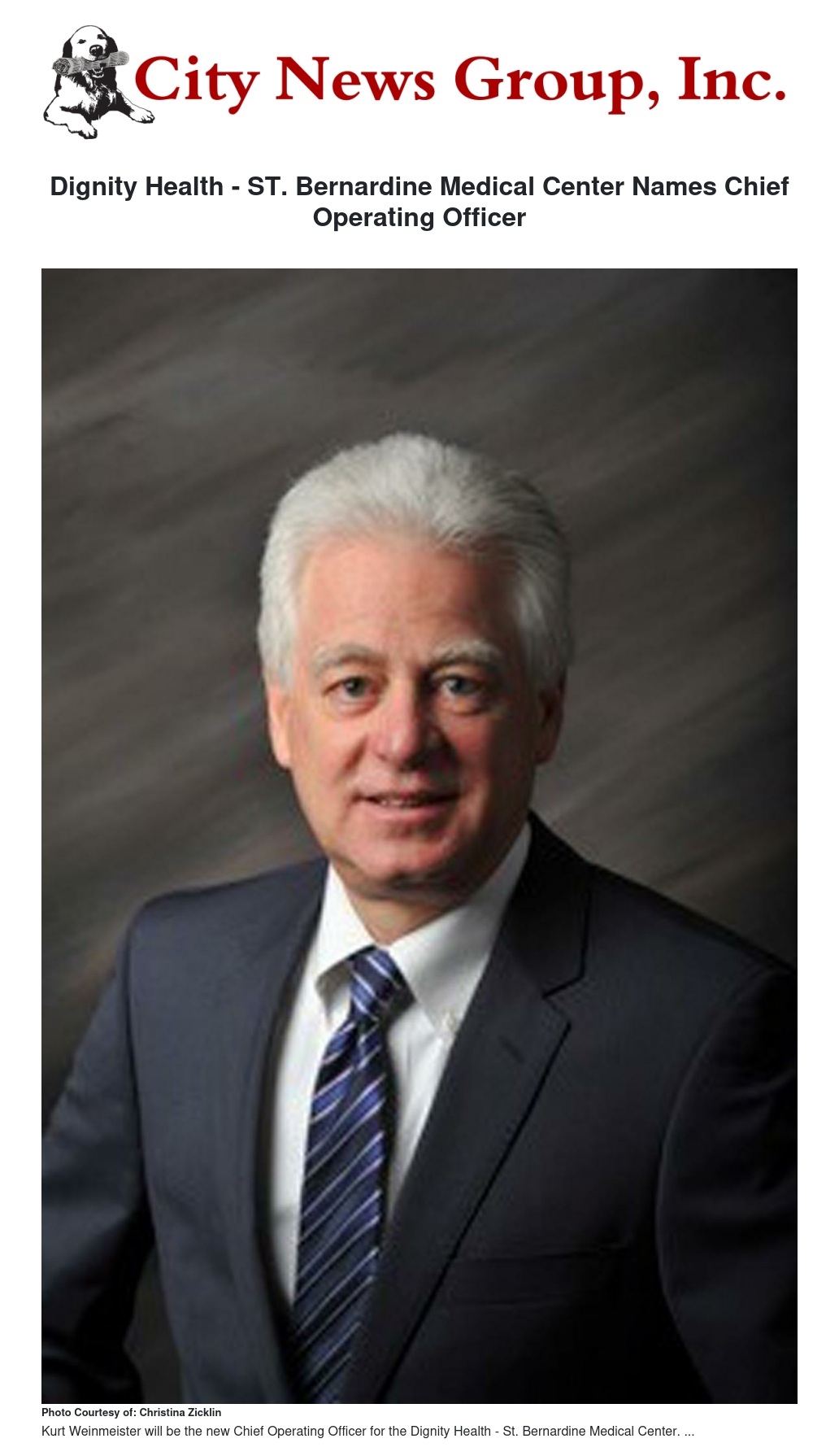 San Bernardino, CA – November 27, 2017 – Dignity Health - St. Bernardine Medical Center (SBMC) announced the appointment of Kurt Weinmeister as Chief Operating Officer (COO). Weinmeister will have strategic and operational oversight of all hospital operations to advance the strategic goals of the organization. Weinmeister has served in health care executive roles for more than 30 years and brings significant experience with leading system-wide initiatives. In some of his previous roles, he created cultures of quality and safety while maintaining fiscal discipline.