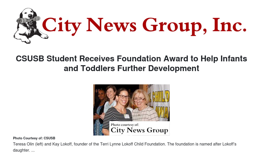 “When I received the letter congratulating me on winning, I was shocked,” said Olin, who had earned her bachelor’s degree in child development from CSUSB. “It's a huge award and I was surprised and grateful that I had won. I am doing what is best for the children and families at my center, and to be recognized with such an award is a truly humbling experience.”
