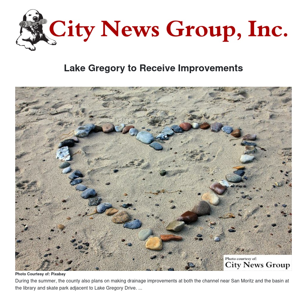 When repairs for the Lake Gregory have been completed, the county plans to work on improving the south swim beach parking lot. From there, they will move on to the San Mortiz area. These improvements will last into August, but are not expected to disrupt usual lake functions. Work will not take place Friday, Saturday, or Sunday.