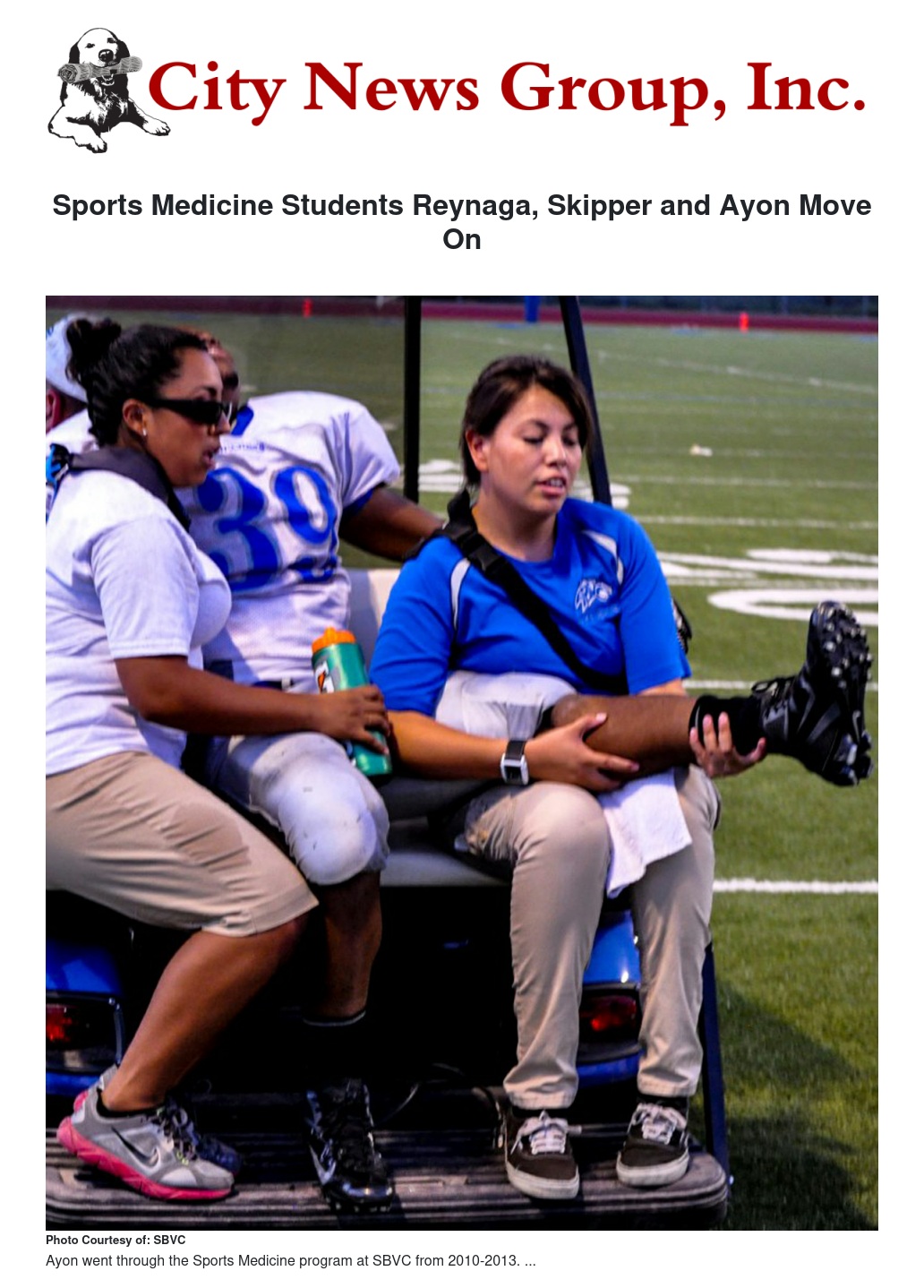 SBVC Sports Medicine alumni Jamie Skipper and Natalia “Bun” Reynaga have been named Certified Athletic Trainers and Diana Ayon has been accepted to Concordia University, Irvine.