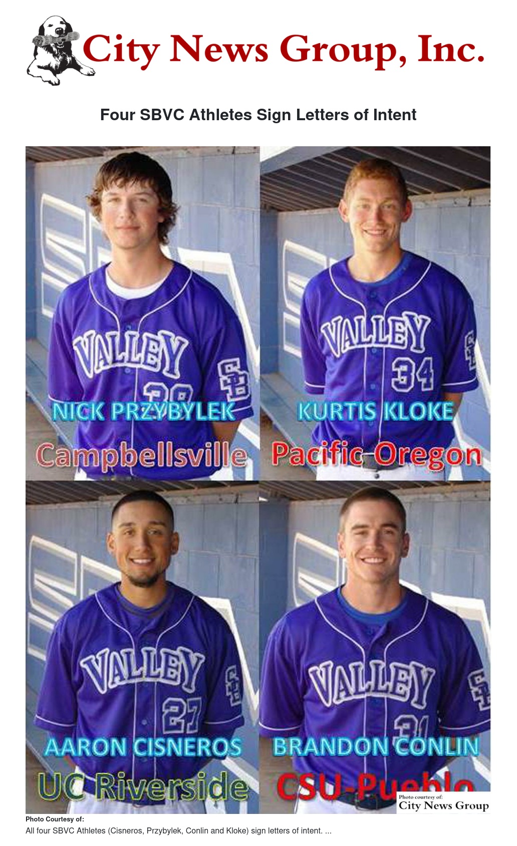 San Bernardino Valley College Baseball’s Nick Przybylek, Aaron Cisneros, Brandon Conlin and Kurtis Kloke have all signed a letters of intent. Przybylek with Campbellsville University, Cisneros with University of California, Riverside, Conlin with Colorado State University-Pueblo and Kloke with Pacific University Oregon.