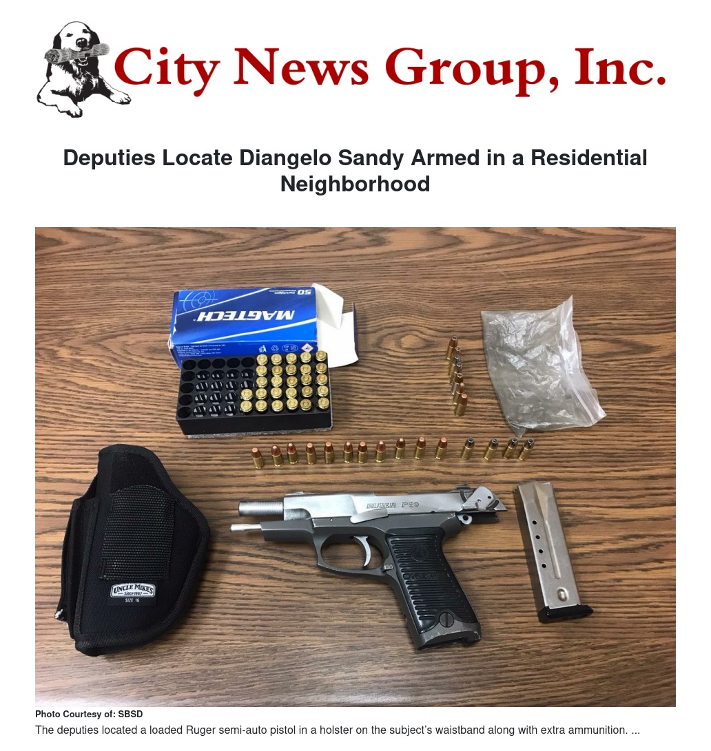 On November 4, 2017, at approximately 3:45 am, Deputy Henry Reyes and Deputy Manuel Tristan were working uniform patrol in the unincorporated areas of San Bernardino. While patrolling the area of Lynwood Drive and Ironwood Street, they noticed Diangelo Sandy sitting on the curb in the residential neighborhood. Due to the late hour, they conducted a pedestrian check to see if Sandy needed assistance or the reason he was loitering in the neighborhood. The deputies did a pat-down search for weapons. The deputies located a loaded Ruger semi-auto pistol in a holster on the subject’s waistband along with extra ammunition. Sandy gave the deputies a false name until his identity was confirmed through fingerprints and prior arrest booking information. After finding his identity, the deputies determined Sandy was on Felony Probation for being a felon in possession of a firearm.