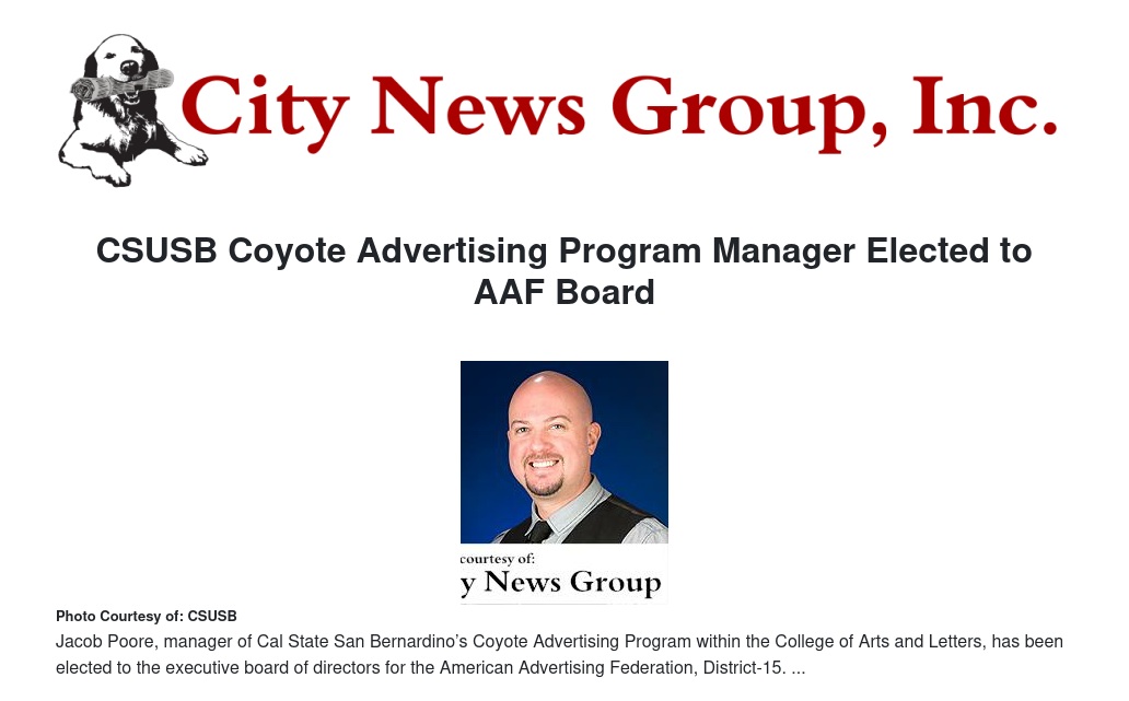 SAN BERNARDINO >> Jacob Poore, manager of Cal State San Bernardino’s Coyote Advertising Program within the College of Arts and Letters, was elected to the executive board of directors for the American Advertising Federation, District-15.