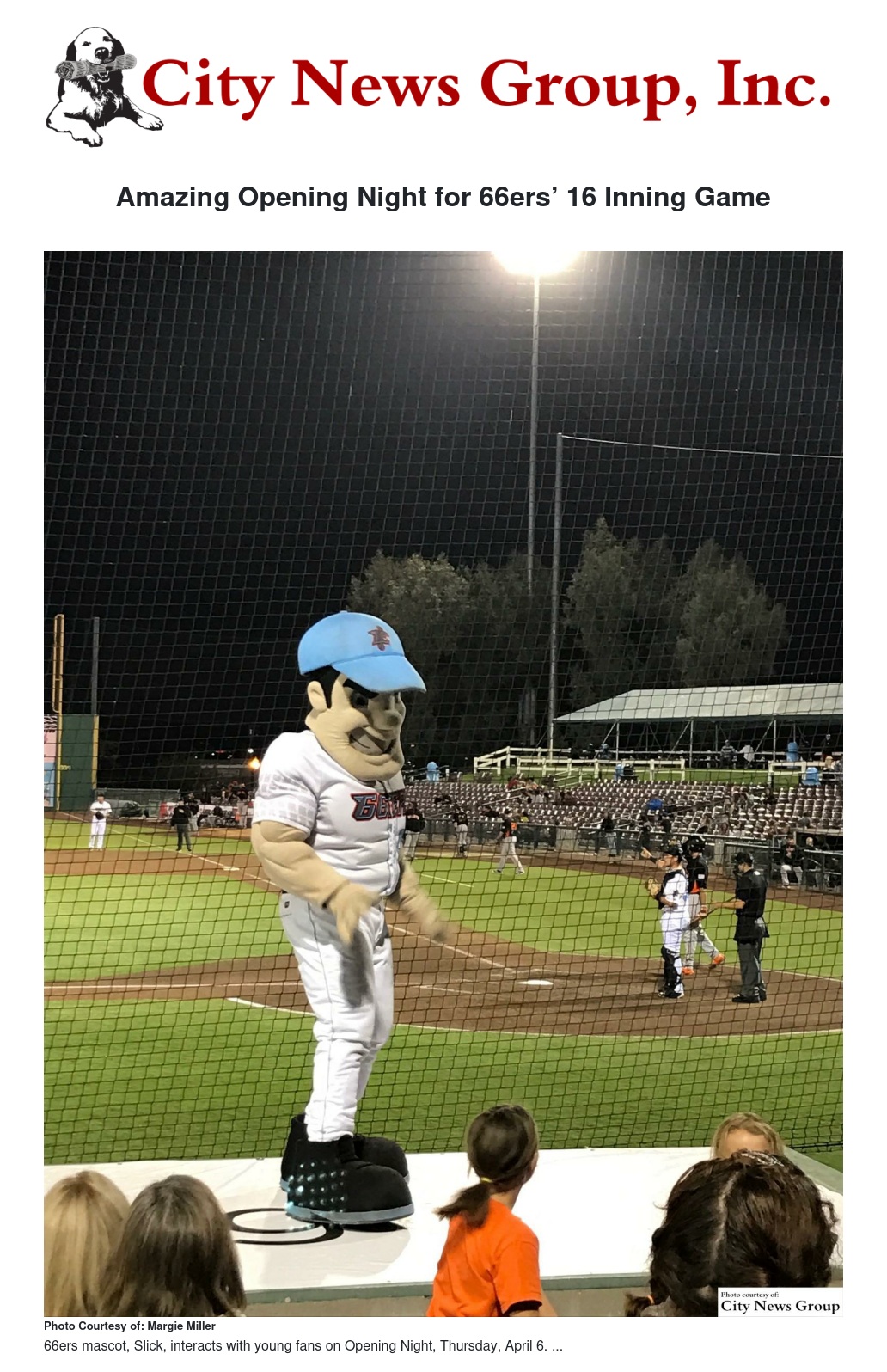 The score stayed even for an extra seven innings when finally, in the bottom of the 16th inning, Michael Hermosillo scored on a walk-off which gave the 66ers a 4-3 victory over the San Jose Giants.