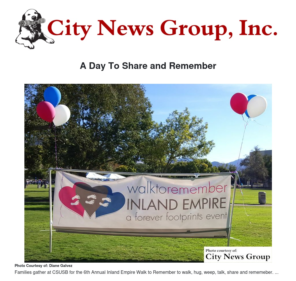 The event on campus that day was the 6th Annual Inland Empire Walk to Remember, hosted by Forever Footprints. It is a walk of remembrance held every October for Pregnancy and Infant Loss Awareness Month. After the memorial ceremony, the phrase “walk the steps that babies will never take” was the cue to begin the Walk to Remember along an approximate 3-mile path of personalized posters. Small and large groups, some with strollers and wagons, made their way to the path.