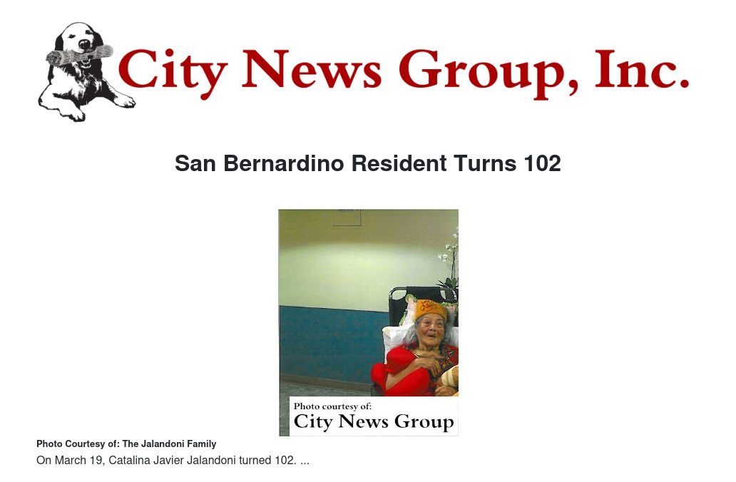 SAN BERNARDINO>> March 19 marked the 102 birthday of San Bernardino resident, Catalina Javier Jalandoni.