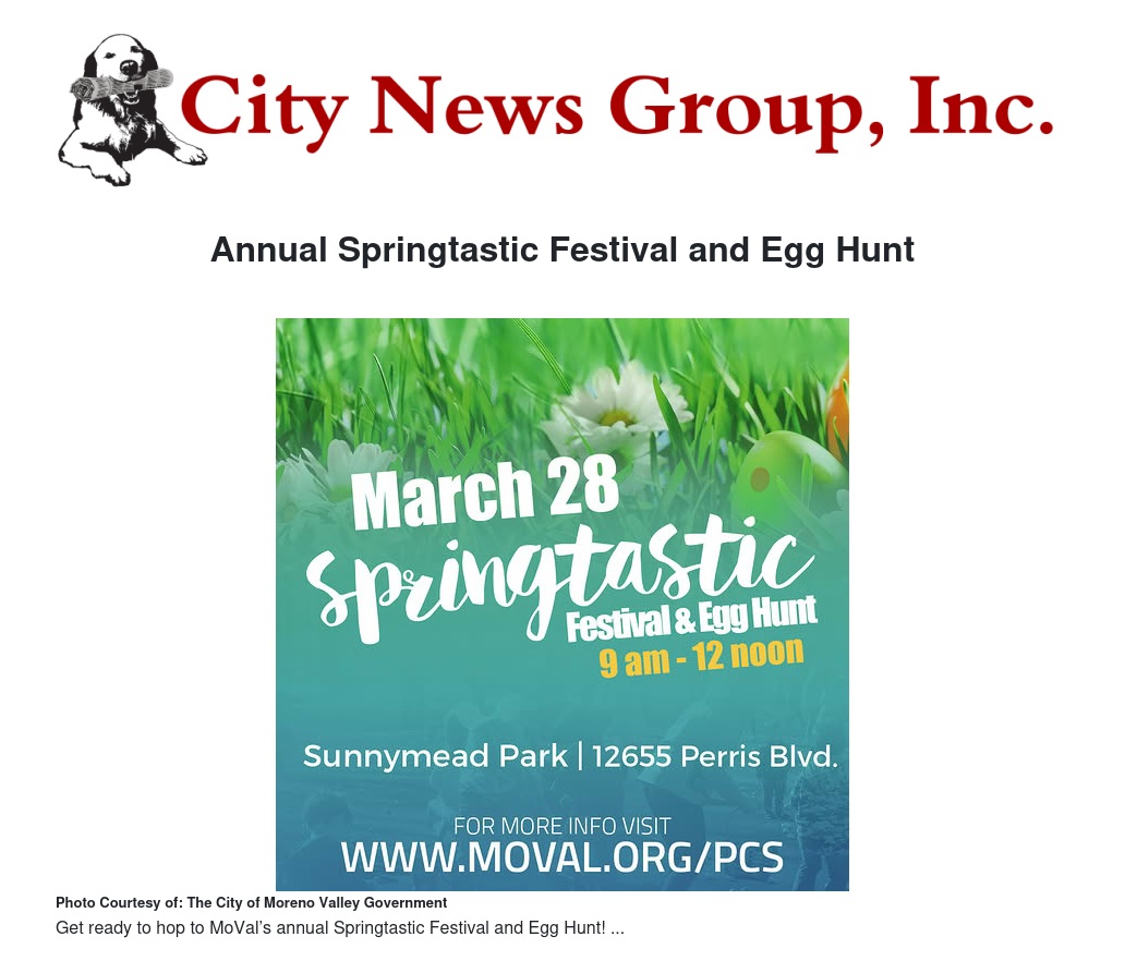 Spring is in the air, and families across Moreno Valley are invited to celebrate the season at the city’s annual Springtastic Festival and Egg Hunt on Saturday, March 28.