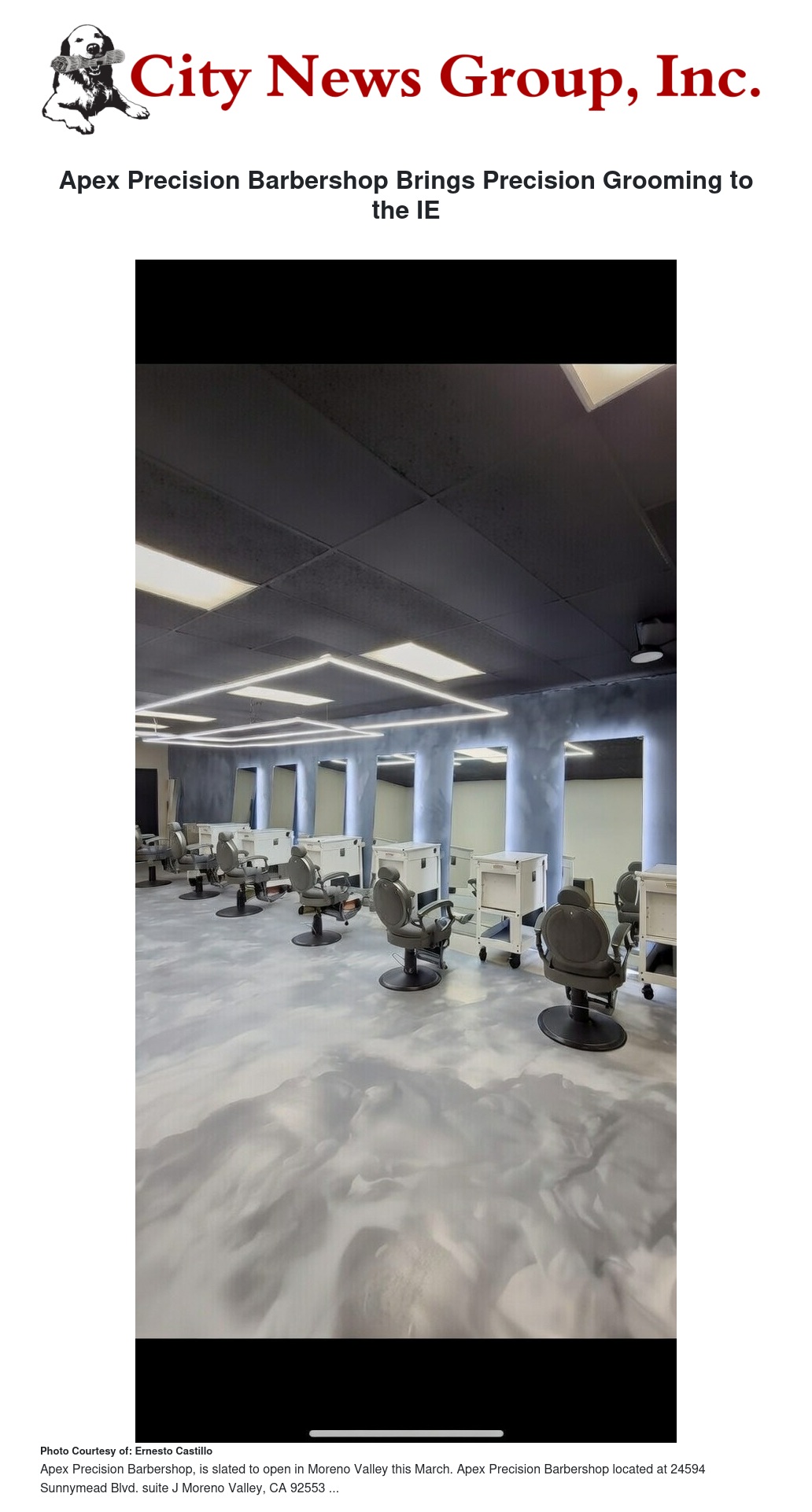A new barbering destination, Apex Precision Barbershop, is slated to open in Moreno Valley this March. The shop — owned and operated by local barber Ernesto Castillo — will be located off Sunnymead Boulevard and aims to provide premium grooming services to the community.