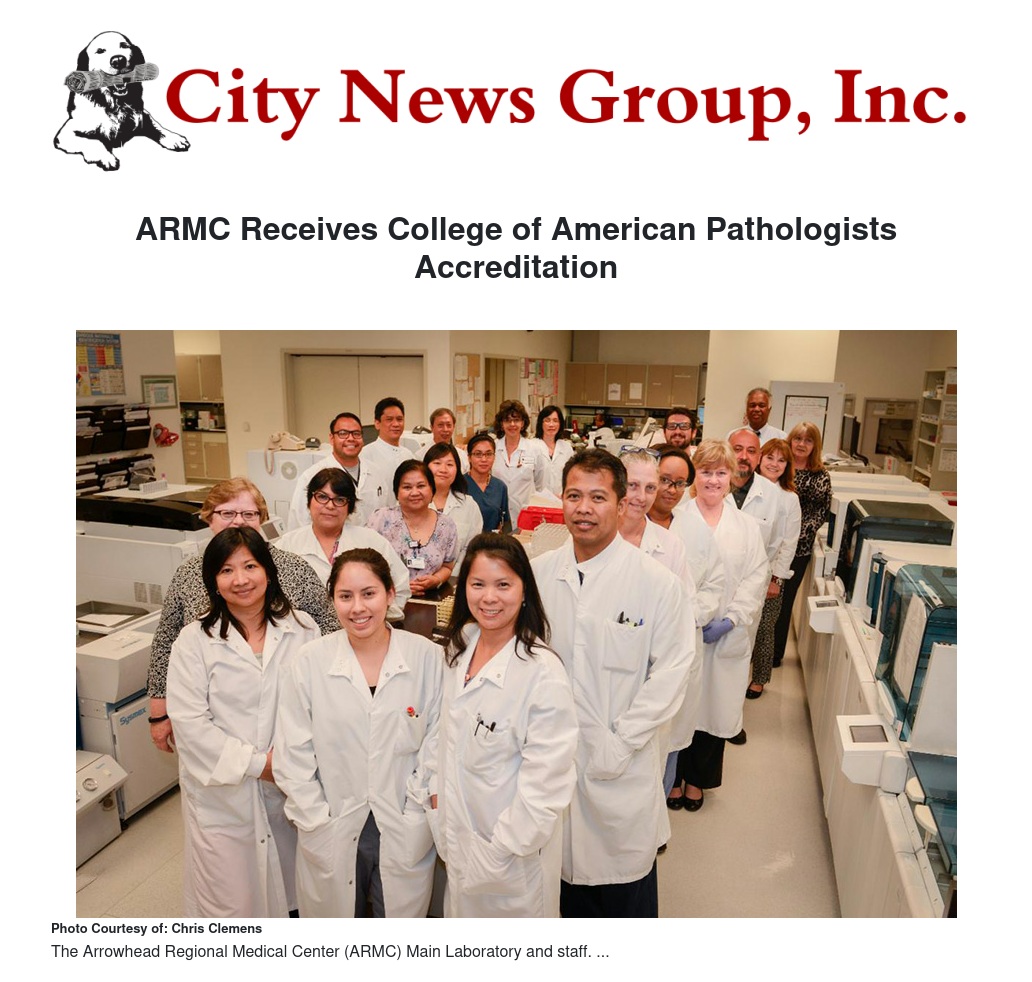 The Arrowhead Regional Medical Center (ARMC) Main Laboratory has been awarded accreditation by the College of American Pathologists (CAP), based on the results of a recent on-site inspection as part of the CAP’s Accreditation Programs.