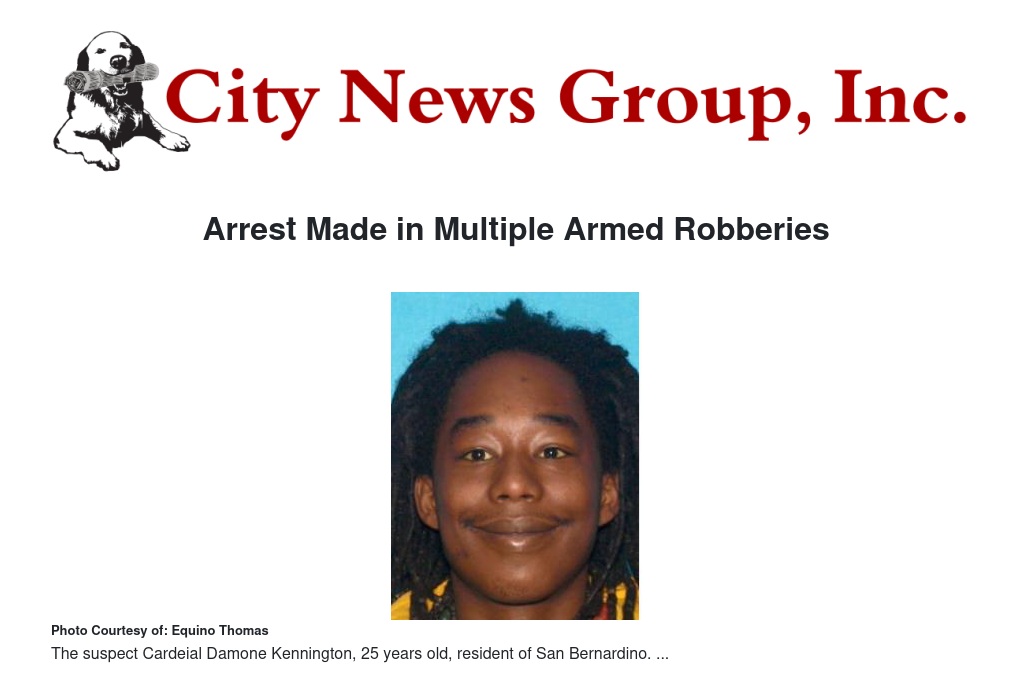 San Bernardino Police Violent Crimes Unit has been investigating an armed robbery series that began on December 11, 2021. The same suspect has been linked to over ten armed robberies over the last three months. On February 5, 2022, the same suspect was involved in an armed robbery of a local business and attempted to flee in a vehicle when uniformed patrol officers intercepted his attempt. The vehicle was being driven by an additional suspect and led police on a high-speed chase through city streets reaching speeds over 80 mph. The pursuit terminated when the suspect's vehicle crashed, and both suspects attempted to flee on foot and were apprehended by officers. Evidentiary items linking Kennington to all ten robberies were found on his person or in the vehicle. All cases will be presented to the San Bernardino County District Attorney’s Office for review.