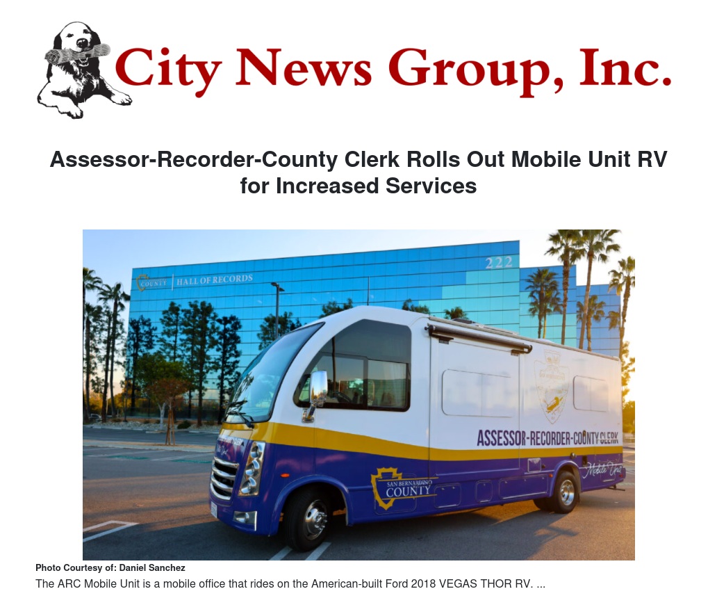 “Through the leadership of our County Supervisors, I am proud to announce the ARC Mobile Unit that gives our department the capability to provide essential services to communities anywhere in San Bernardino County,” said San Bernardino County Assessor-Recorder-Clerk Bob Dutton. “ARC services will now be accessible to more residents in San Bernardino County. With safety being a priority, we can provide services outdoors that promotes social distancing to keep both customers and staff safe.”