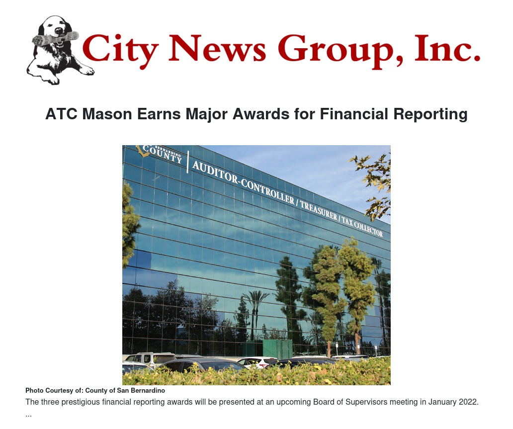 San Bernardino County Auditor-Controller/Treasurer/Tax Collector (ATC) Ensen Mason has been notified that his office has earned three prestigious financial reporting awards. The Certificate of Achievement for Excellence in Financial Reporting for the Annual Comprehensive Financial Report (ACFR) and the Award for Outstanding Achievement in Popular Annual Financial Reporting (PAFR) are given by the Government Finance Officers Association (GFOA). In addition, ATC Mason is receiving the State Controller’s Award for Counties Financial Transactions Reporting awarded on behalf of California State Controller Betty T. Yee. All three awards will be presented to Mr. Mason and staff at an upcoming Board of Supervisors meeting in January 2022.
